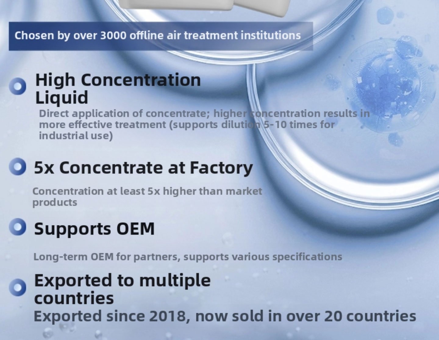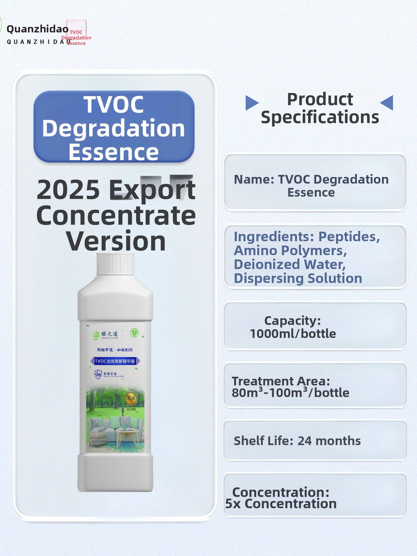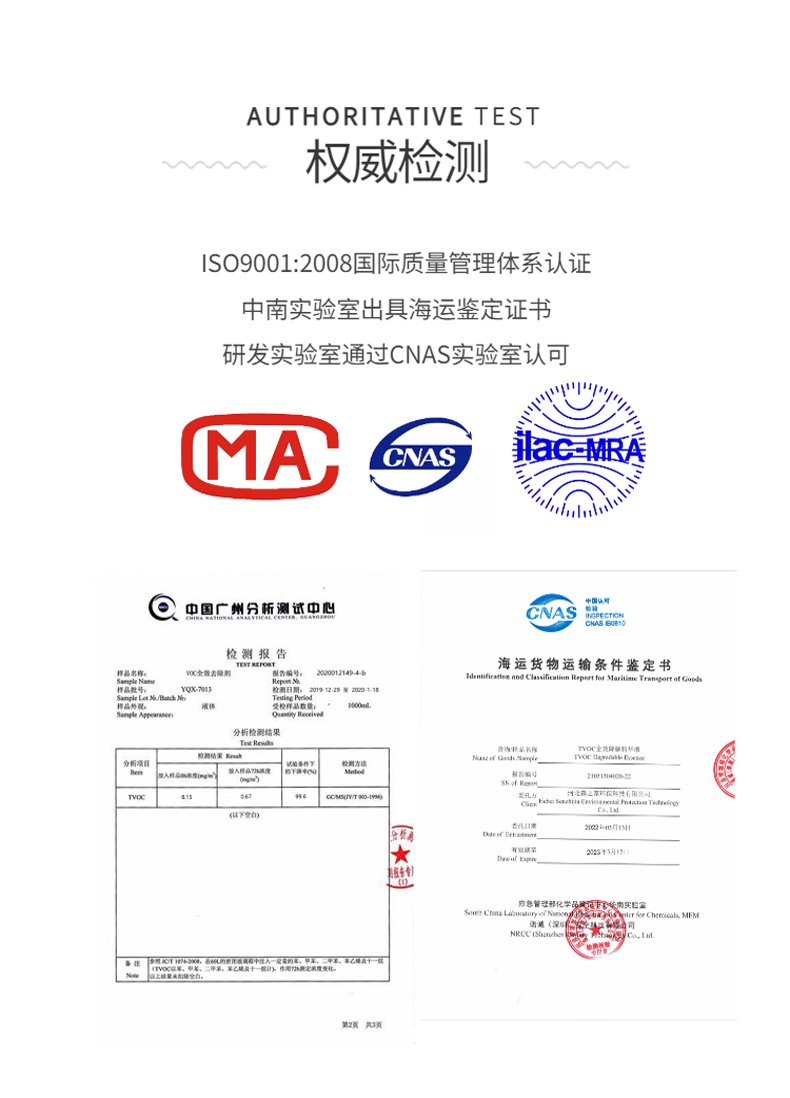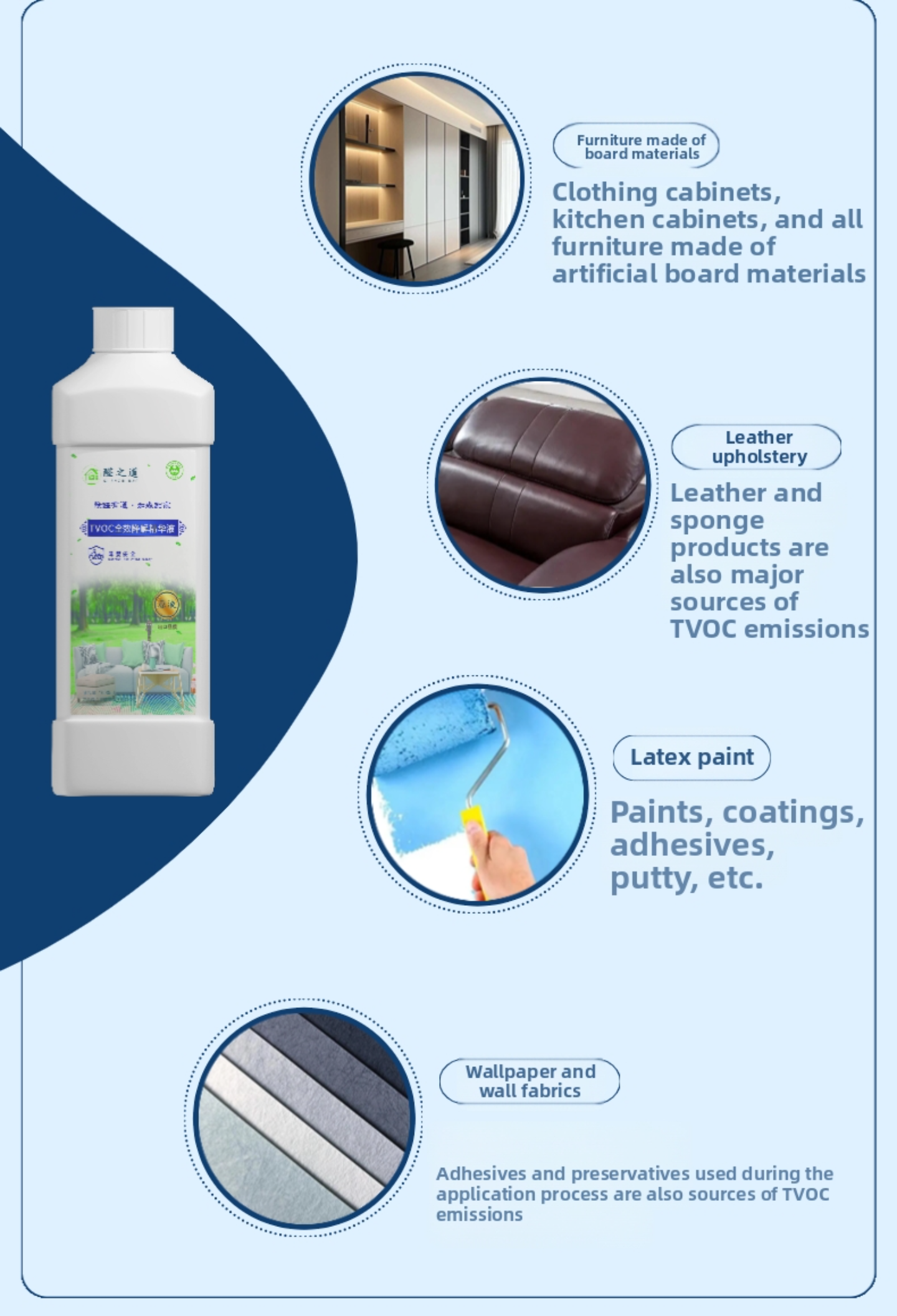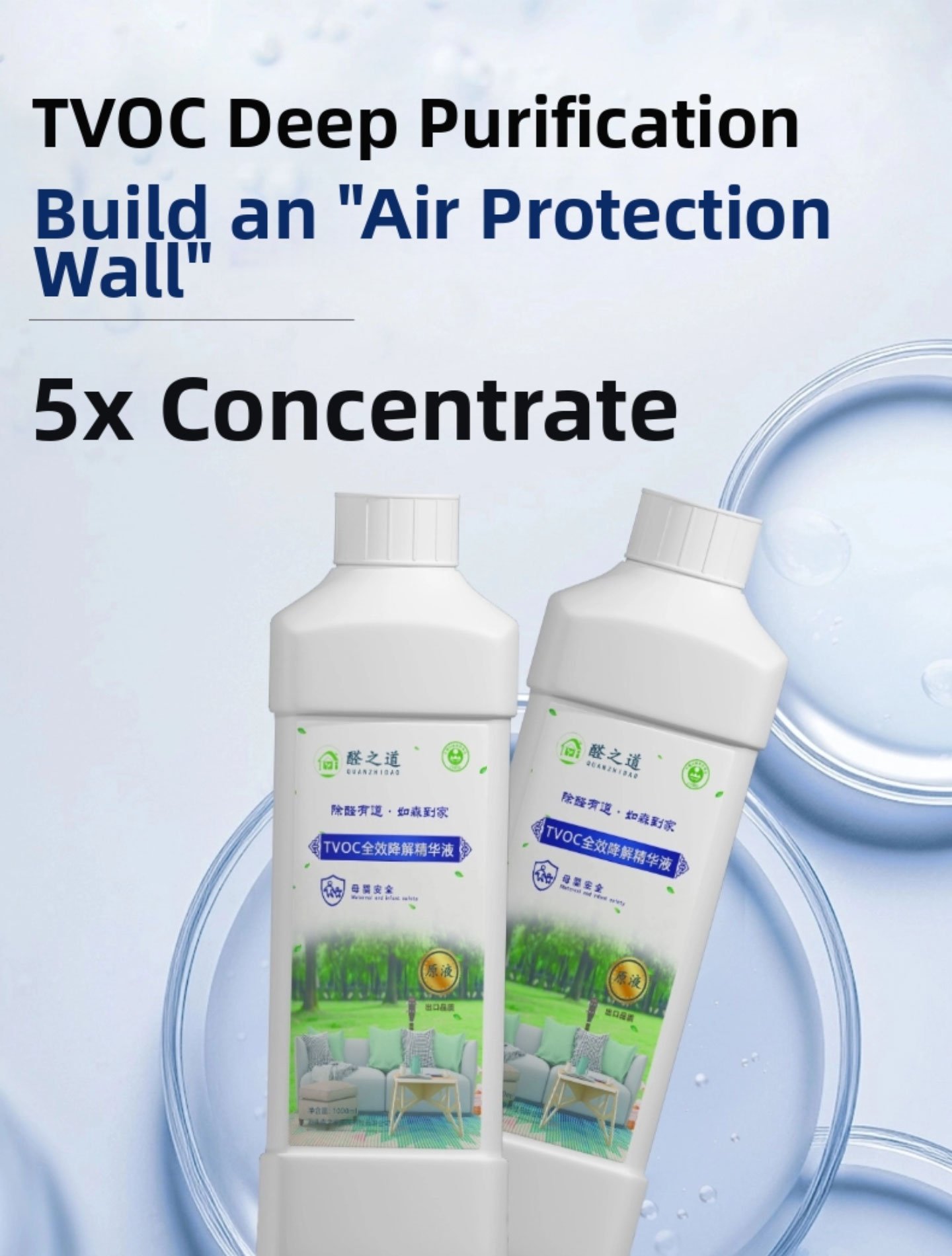 This product is produced by introducing foreign advanced biological enzyme degradation technology.The main components of the product are biological enzymes,which can effectively decompose harmful gases and reduce the tatal volatilization of TVOC through the growth of microorganisms.The product has a lasting effect,and the product is stable,non-toxic and harmless,without secondary pollution.